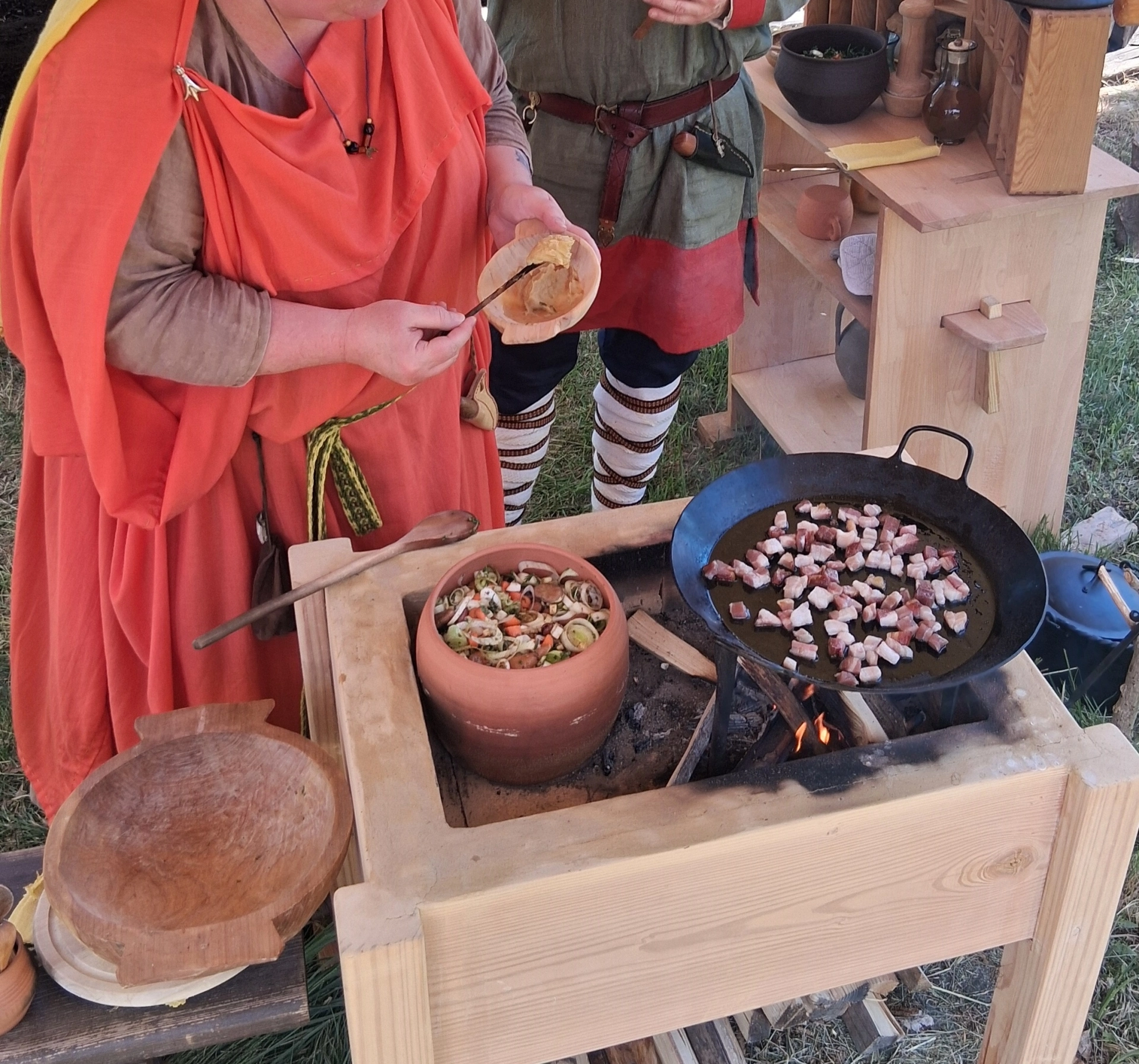 Für das leibliche Wohl sorgen germanische und römische Köstlichkeiten, die auf offenem Feuer und im Lehmbackofen zubereitet werden. Wie kocht man in Tontöpfen? Was wächst im Garten und auf den Feldern der Langobarden? Wie schmeckt Garum, die berüchtigte römische Soße aus vergorenem Fisch?