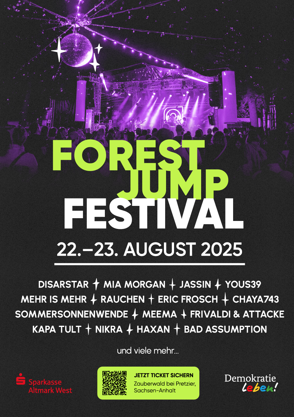 Am 22. und 23. August lädt euch der Zauberwald bei Pretzier wieder zum Forest Jump Festival ein. Ein Wochenende rauskommen aus dem Alltag; Sorgen und Probleme für einige Tage vergessen und einen Sack voll Freund*innen, Liebe und Tanzwut mit auf den Campingplatz bringen, um alles vor der Bühne raus zu lassen. Holt euch euer Ticket und tanzt mit uns die letzten Sommernächte des Jahres durch. Einige Kombi- und Tagestickets sind noch verfügbar und wie immer auf unserer Website unter forestjump-festival.de/ticketszu bekommen.