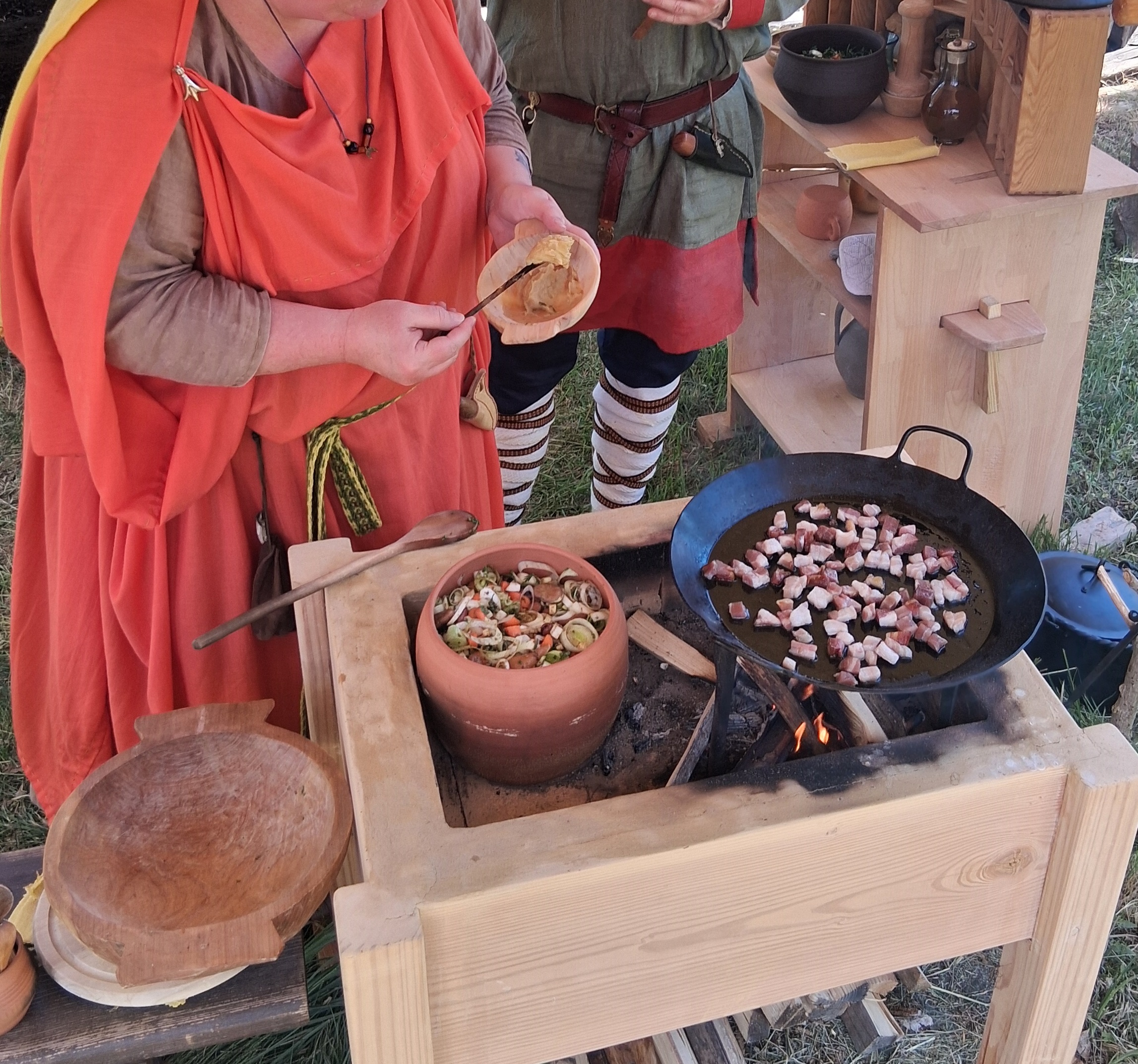 Für das leibliche Wohl sorgen germanische und römische Köstlichkeiten, die auf offenem Feuer und im Lehmbackofen zubereitet werden. Wie kocht man in Tontöpfen? Was wächst im Garten und auf den Feldern der Langobarden? Wie schmeckt Garum, die berüchtigte römische Soße aus vergorenem Fisch?