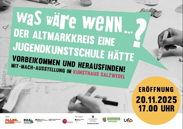 Die Ausstellung präsentiert über einen Zeitraum von sechs Wochen Werke und Dokumentationen aus Formaten kultureller Bildung sowie den aktuellen Konzeptstand der Jugendkunstschule. Eine interaktive Altmark-Karte macht mögliche Standorte der Gläsernen Ateliers sichtbar und lädt zum Austausch über die Weiterentwicklung des Projekts ein. Eingeladen sind Interessierte aus allen Bereichen – Familien, Kitas, Schulen, Vereine, Politiker:innen, Künstler:innen, Wissenschaftler:innen sowie natürlich Kinder und Jugendliche. In verschiedenen Mitmach-Formaten können Besucher:innen ihre Ideen einbringen und das Projekt aktiv mitgestalten.